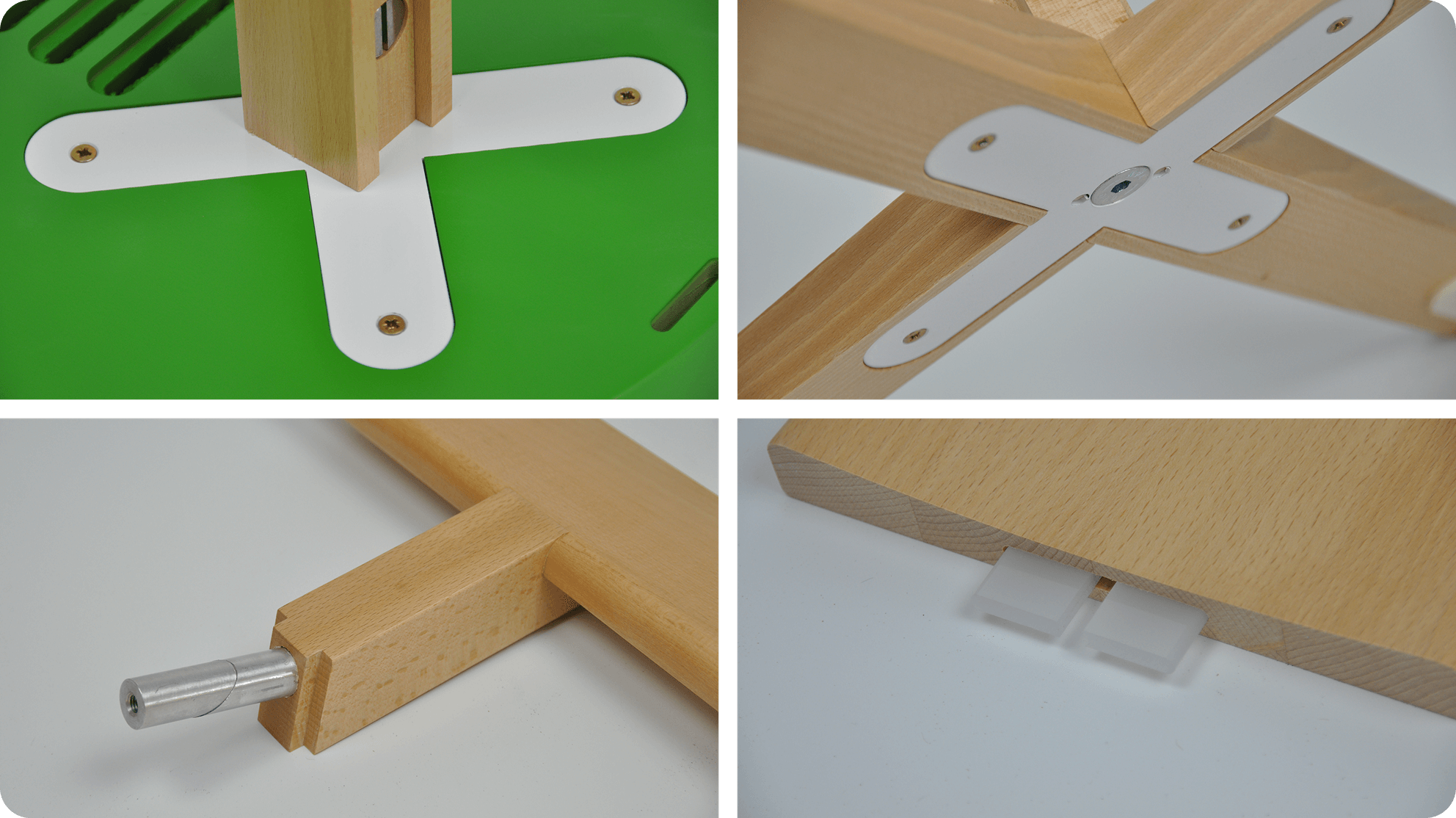 Two 4-mm thick metal crossbars that are built in under the seat and under the wooden crossbar, are what makes the high chair incredibly stable. The wooden bar for the feet and the wooden back support also use binding elements and hidden screws that add to the high chair’s robustness.